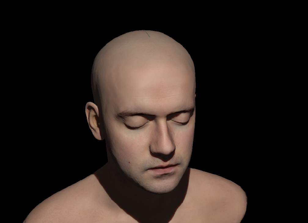 The head mesh applied is a head scan of Lee Perry-Smith obtained from Morgan McGuire's Computer Graphics Archive and comes with a height map which needs to be converted to normals. The generation of normals is done on the fly in the fragment shader using an algorithm presented in [And07]J. Andersson. Terrain Rendering in Frostbite Using Procedural Shader Splatting, 2007